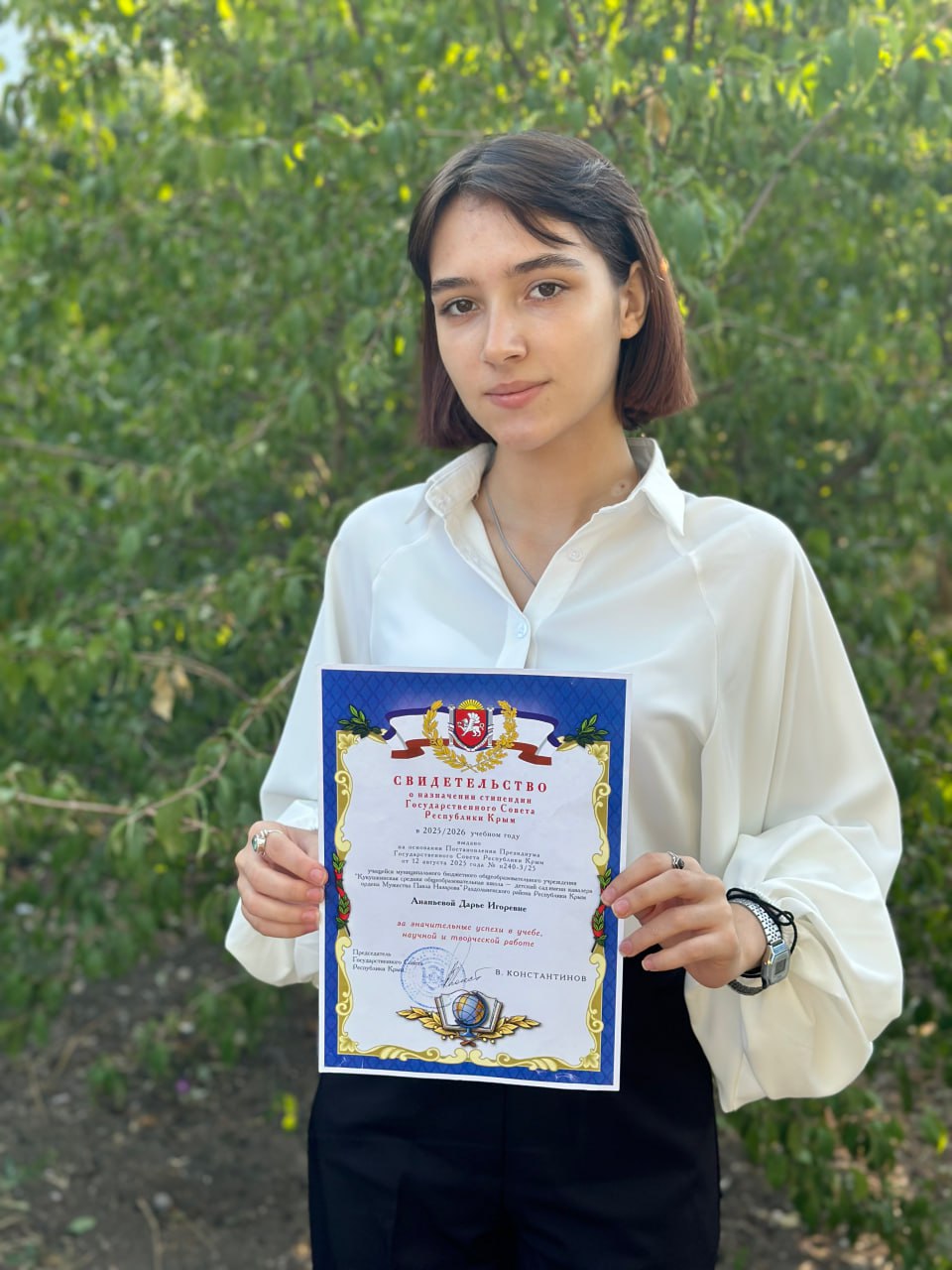 В 2025/2026 учебном году стипендиатом Государственного Совета Республики Крым в МБОУ "Кукушкинская школа-детский сад" стала ученица 10 класса Ананьева Дарья.